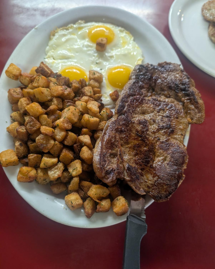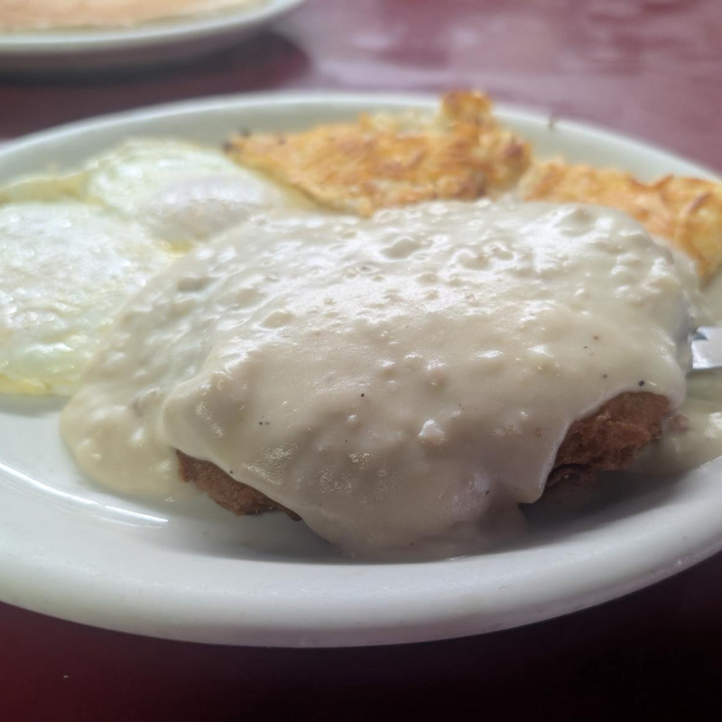Chicken fried steak, 2 eggs, half waffle or French toast,